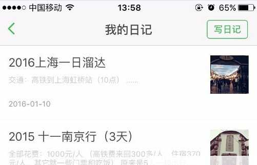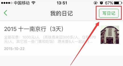 进入写日记界面后,可以看到自己原来已发的日记。在之前的版本,这个“写日记”的按钮是灰色的,所以无法在手机端写日记。点击“写日记”按钮进入。