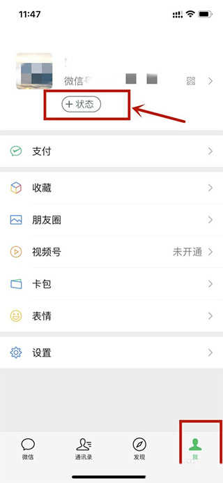 1、首先打开微信8.0版本,点击“我的”,点击头像下方的“+状态”