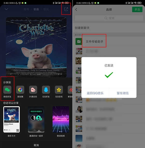 首先打开QQ音乐,查找一首自己喜欢的歌曲。然后点击右上角的“分享”图标,将它分享到微信“文件传输助手”下。