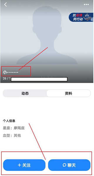 5、在该用户界面,我们可以点击底部的操作,进行关注或聊天。
