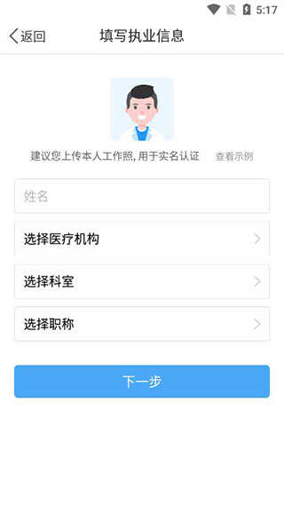 2、之后输入自己的真实姓名,并选择医疗机构、科室、以及职称