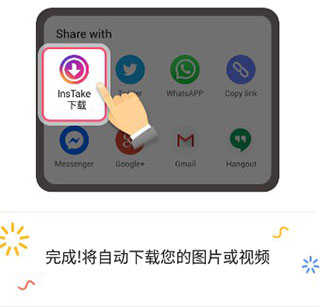2、选择分享到instake下载器,即可自动帮你下载图片/视频啦