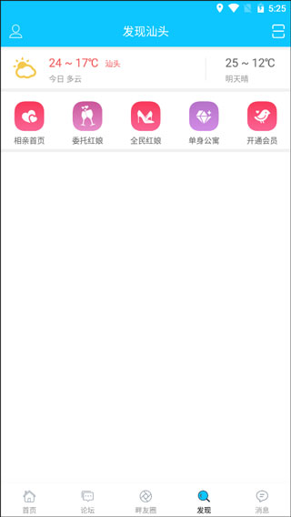 5、在发现板块中,有着相亲首页、委托红娘、全民红娘、单身公寓、开通会员等功能,以及河畔的天气预报服务。=