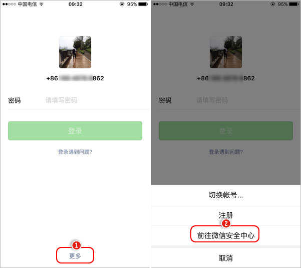 若没有登录遇到问题的选项,请点击“更多”->前往微信安全中心->找回帐号密码->通过申诉找回帐号密码。