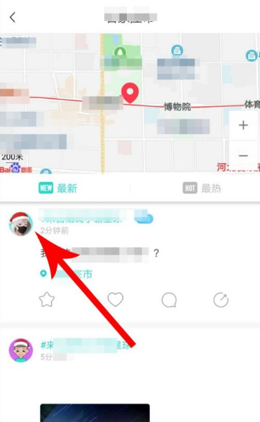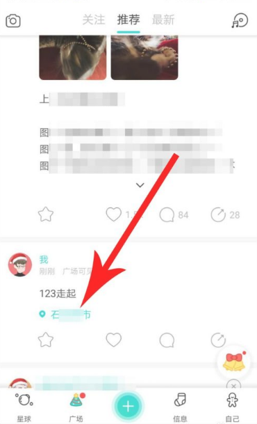 返回到“广场”菜单的“推荐”界面,向下滑动页面刷新后,就可以看到自己发布的瞬间了,然后点击自己添加的位置