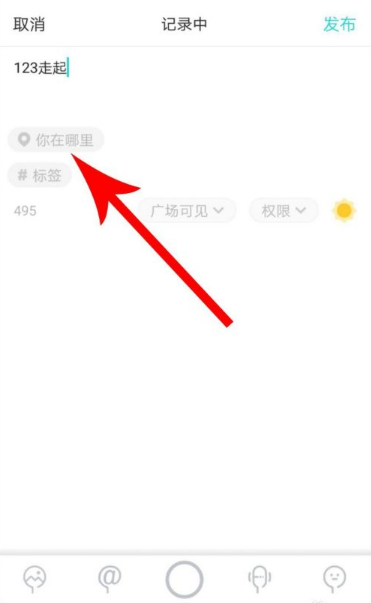 这时打开的是编辑瞬间的界面,在文字编辑区书写文字后点击“你在哪里”,位置见下图