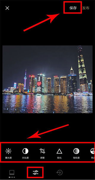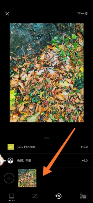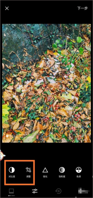 3、然后点击下面的三角形,进入选择框,选择其他的修图功能(裁剪、饱和、对比等)。